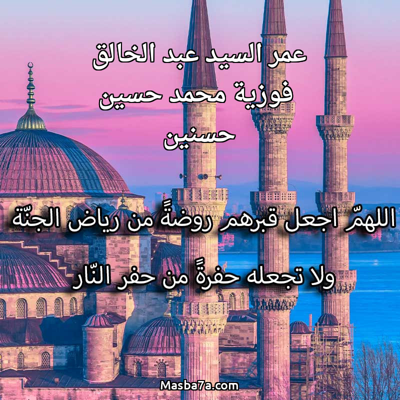 اللهم ارحم ( عمر السيد عبد الخالق فوزية محمد حسين حسنين ) وانس وحشتهم واجمعنا بهم في جنتك ، اللهم ارحمهم بقدر شوقنا لهم اللهم ارحمهم واغفر لهم.