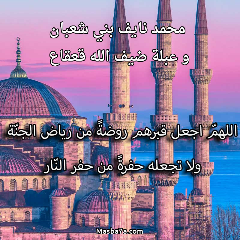 اللهم ارحم ( محمد نايف بني شعبان و عبلة ضيف الله قعقاع ) وانس وحشتهم واجمعنا بهم في جنتك ، اللهم ارحمهم بقدر شوقنا لهم اللهم ارحمهم واغفر لهم.