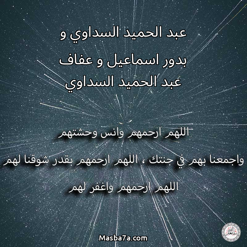اللهم ارحم ( عبد الحميد السداوي و بدور اسماعيل و عفاف عبد الحميد السداوي ) وانس وحشتهم واجمعنا بهم في جنتك ، اللهم ارحمهم بقدر شوقنا لهم اللهم ارحمهم واغفر لهم.