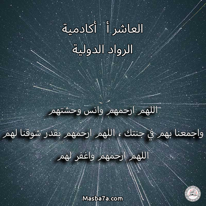 اللهم ارحم ( العاشر أ - أكادمية الرواد الدولية ) وانس وحشتهم واجمعنا بهم في جنتك ، اللهم ارحمهم بقدر شوقنا لهم اللهم ارحمهم واغفر لهم.