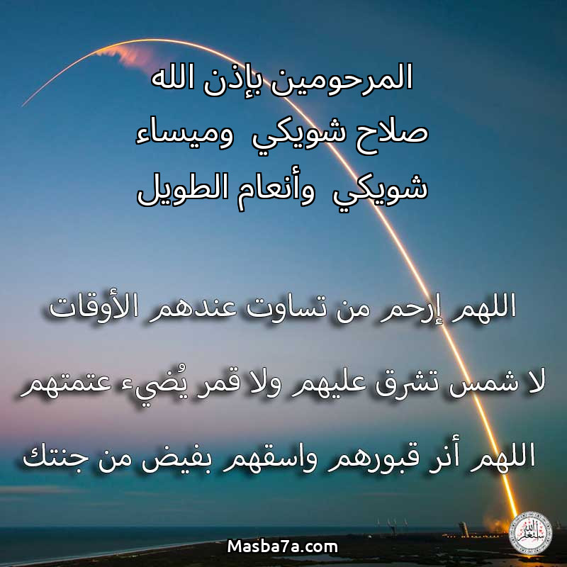 اللهم ارحم ( المرحومين بإذن الله صلاح شويكي وميساء شويكي وأنعام الطويل ) وانس وحشتهم واجمعنا بهم في جنتك ، اللهم ارحمهم بقدر شوقنا لهم اللهم ارحمهم واغفر لهم.