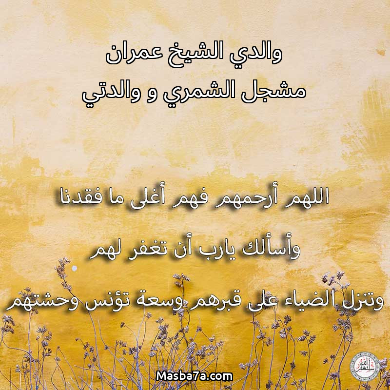 اللهم ارحم ( والدي الشيخ عمران مشجل الشمري و والدتي ) وانس وحشتهم واجمعنا بهم في جنتك ، اللهم ارحمهم بقدر شوقنا لهم اللهم ارحمهم واغفر لهم.