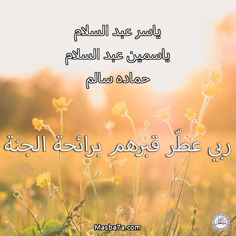 اللهم ارحم ( ياسر عبد السلام -ياسمين عبد السلام -حماده سالم ) وانس وحشتهم واجمعنا بهم في جنتك ، اللهم ارحمهم بقدر شوقنا لهم اللهم ارحمهم واغفر لهم.