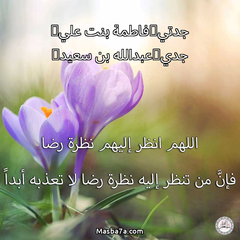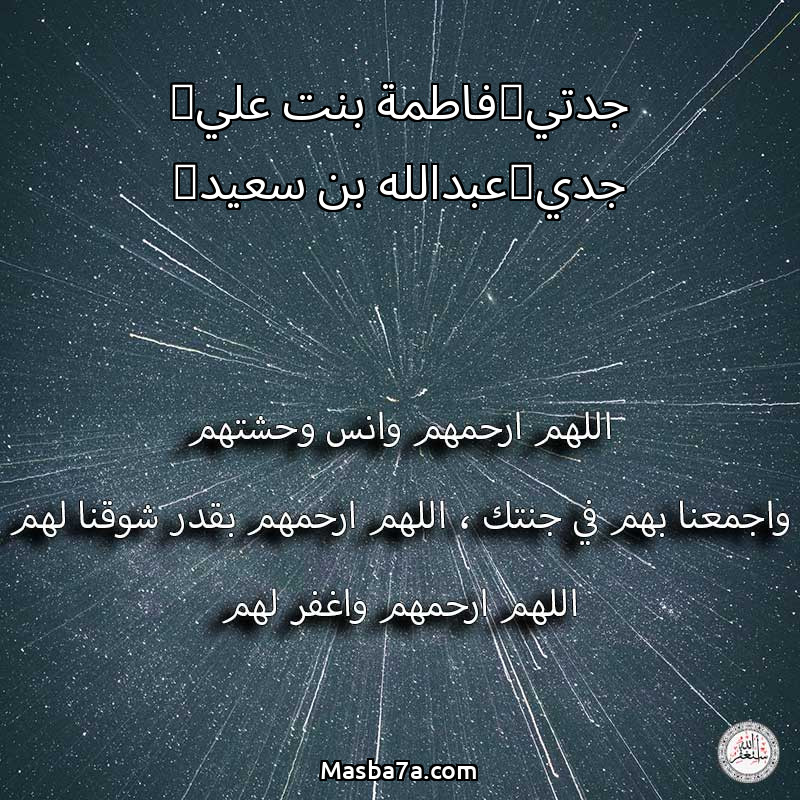 اللهم ارحم ( جدتي(فاطمة بنت علي) جدي(عبدالله بن سعيد) ) وانس وحشتهم واجمعنا بهم في جنتك ، اللهم ارحمهم بقدر شوقنا لهم اللهم ارحمهم واغفر لهم.