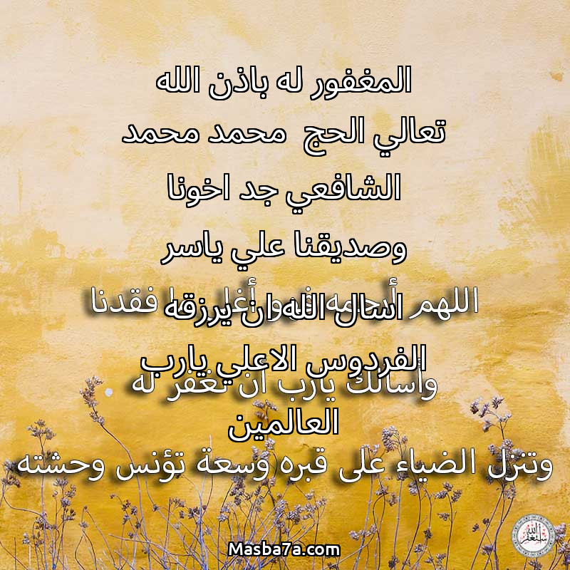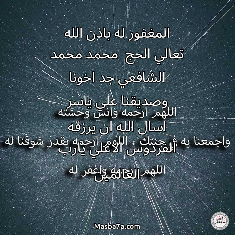 دعاء عن روح المرحوم المغفور له باذن الله تعالي الحج محمد محمد الشافعي جد اخونا وصديقنا علي ياسر اسال الله ان يرزقه الفردوس الاعلي يارب العالمين