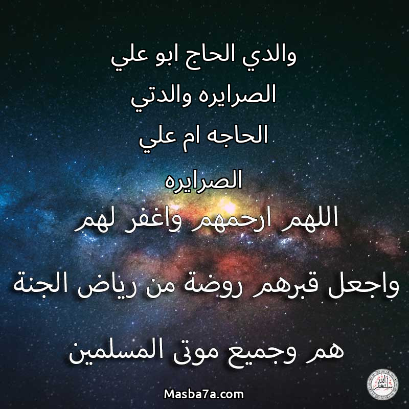 اللهم ارحم ( والدي الحاج ابو علي الصرايره والدتي الحاجه ام علي الصرايره ) وانس وحشتهم واجمعنا بهم في جنتك ، اللهم ارحمهم بقدر شوقنا لهم اللهم ارحمهم واغفر لهم.