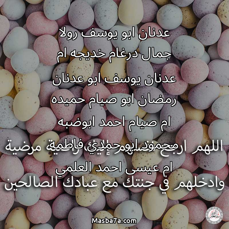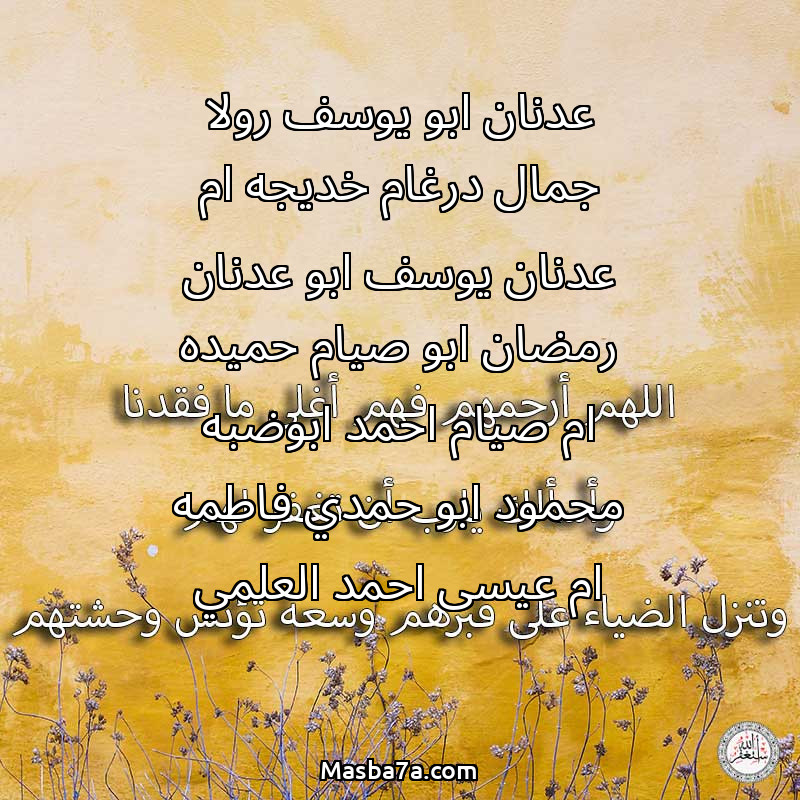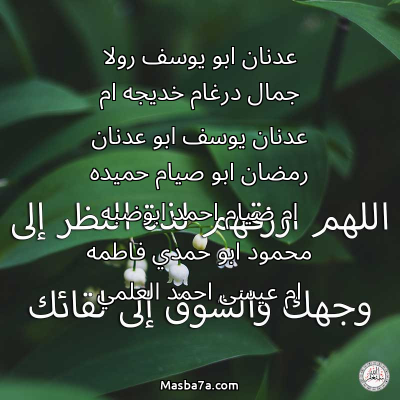 دعاء عن أرواح المرحومين عدنان ابو يوسف رولا جمال درغام خديجه ام عدنان يوسف ابو عدنان رمضان ابو صيام حميده ام صيام احمد ابوضبه محمود ابو حمدي فاطمه ام عيسى احمد العلمي