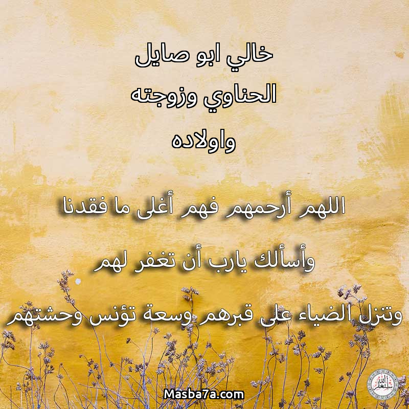 اللهم ارحم ( خالي ابو صايل الحناوي وزوجته واولاده ) وانس وحشتهم واجمعنا بهم في جنتك ، اللهم ارحمهم بقدر شوقنا لهم اللهم ارحمهم واغفر لهم.
