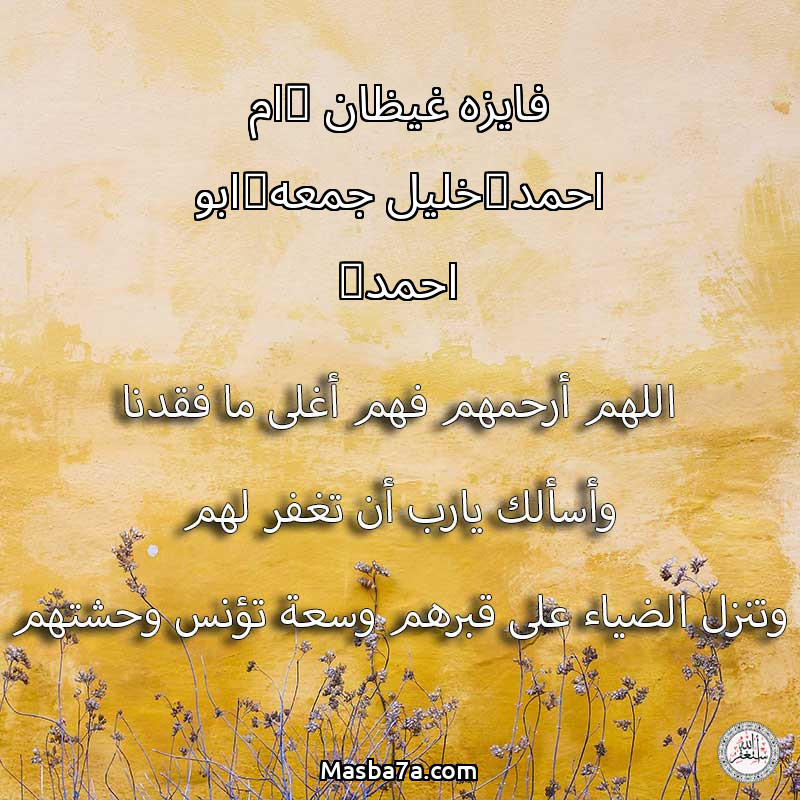 اللهم ارحم ( فايزه غيظان (ام احمد)خليل جمعه(ابو احمد) ) وانس وحشتهم واجمعنا بهم في جنتك ، اللهم ارحمهم بقدر شوقنا لهم اللهم ارحمهم واغفر لهم.