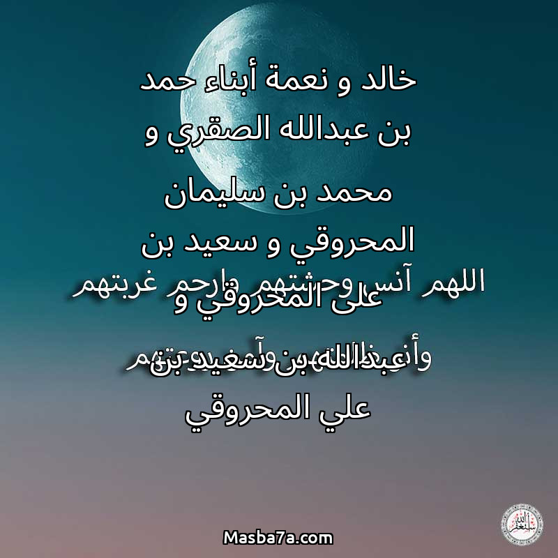 اللهم ارحم ( خالد و نعمة أبناء حمد بن عبدالله الصقري و محمد بن سليمان المحروقي و سعيد بن على المحروقي و عبدالله بن سعيد بن علي المحروقي ) وانس وحشتهم واجمعنا بهم في جنتك ، اللهم ارحمهم بقدر شوقنا لهم اللهم ارحمهم واغفر لهم.