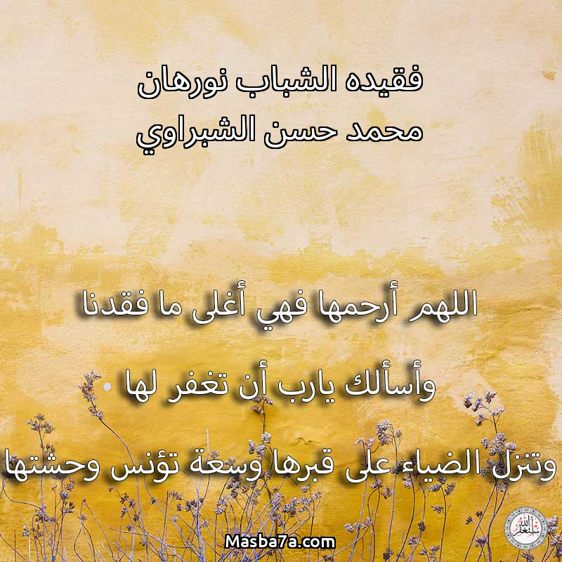 اللهم ارحم ( فقيده الشباب نورهان محمد حسن الشبراوي ) وانس وحشتها واجمعنا بها في جنتك ، اللهم ارحمها بقدر شوقنا لها اللهم ارحمها واغفر لها .