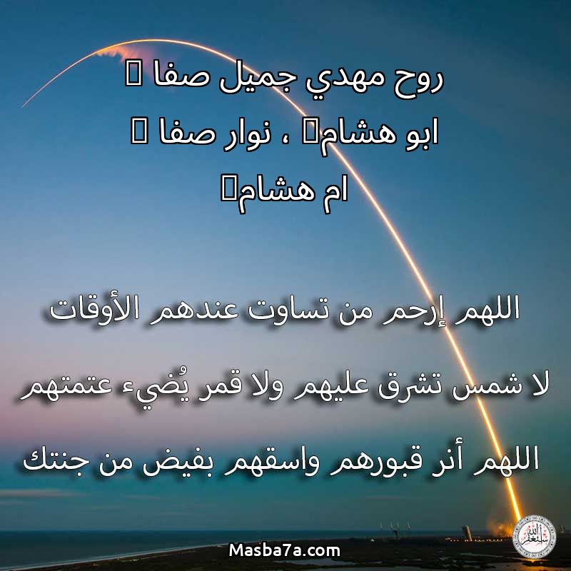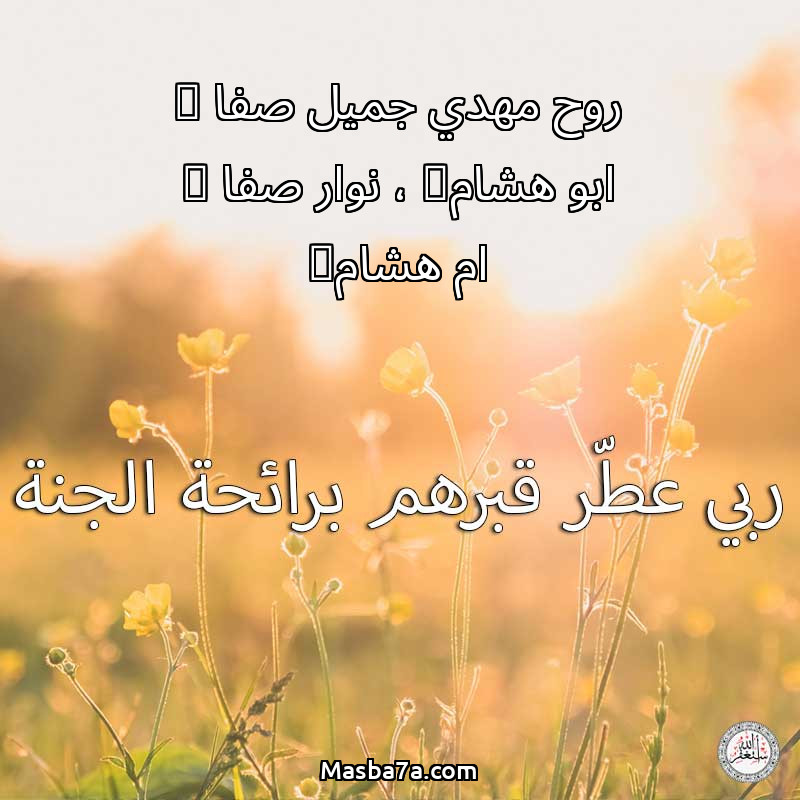 اللهم ارحم ( روح مهدي جميل صفا ( ابو هشام) ، نوار صفا ( ام هشام) ) وانس وحشتهم واجمعنا بهم في جنتك ، اللهم ارحمهم بقدر شوقنا لهم اللهم ارحمهم واغفر لهم.