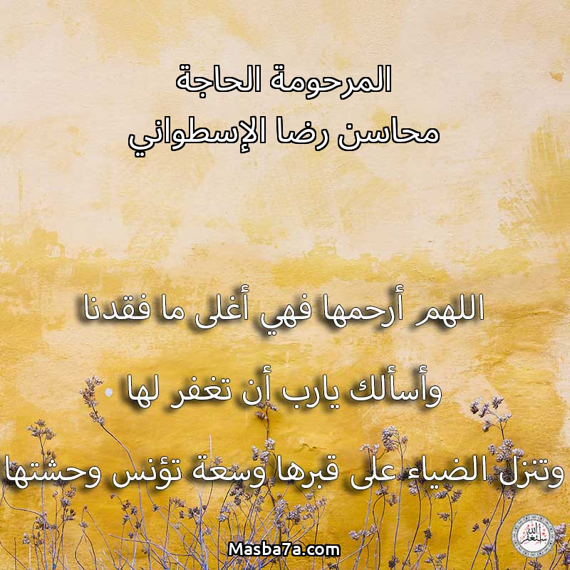 اللهم ارحم ( المرحومة الحاجة محاسن رضا الإسطواني ) وانس وحشتها واجمعنا بها في جنتك ، اللهم ارحمها بقدر شوقنا لها اللهم ارحمها واغفر لها .