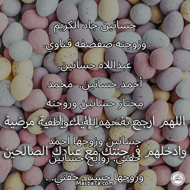 اللهم ارحم ( حسانين جاد الكريم وزوجته صفصفه قناوي. عبداللاه حسانين. أحمد حسانين. محمد مختار حسانين وزوجته حمديه حمدالله. عواطف حسانين وزوجها احمد حفني. روايح حسانين وزوجها حسين حفني. . السيد عباس وامه انصاف قناوي. ممدوح السيد ) وانس وحشتهم واجمعنا بهم في جنتك ، اللهم ارحمهم بقدر شوقنا لهم اللهم ارحمهم واغفر لهم.