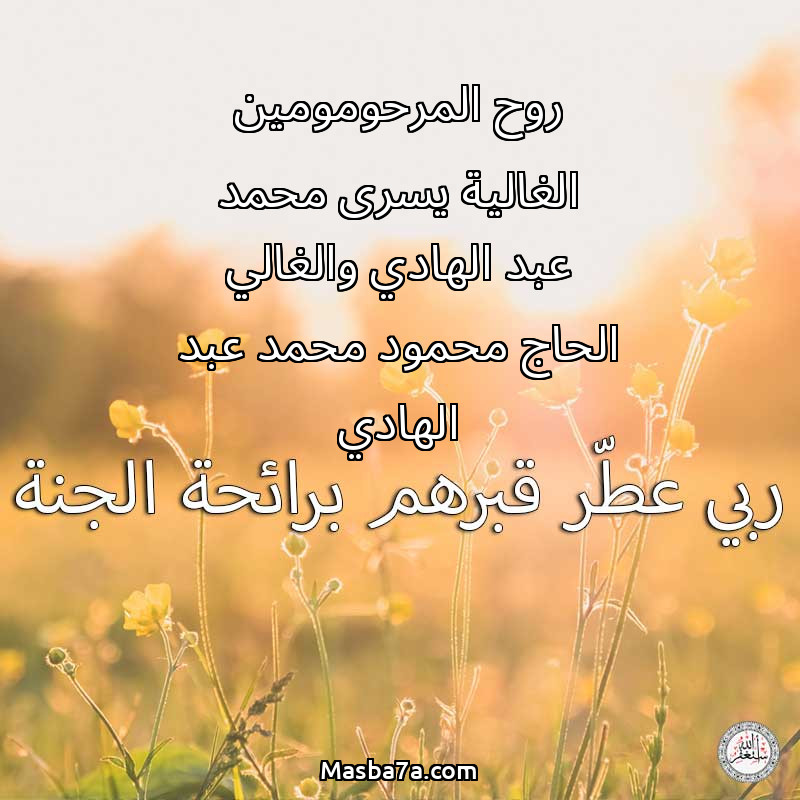 اللهم ارحم ( روح المرحومومين الغالية يسرى محمد عبد الهادي والغالي الحاج محمود محمد عبد الهادي ) وانس وحشتهم واجمعنا بهم في جنتك ، اللهم ارحمهم بقدر شوقنا لهم اللهم ارحمهم واغفر لهم.
