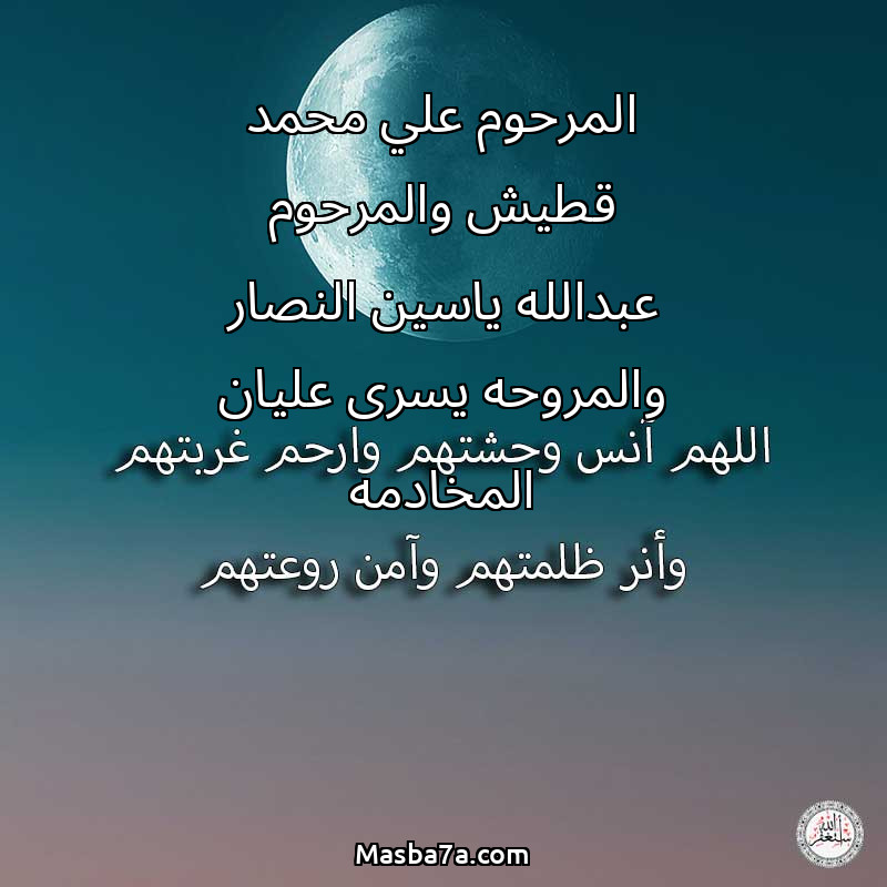 اللهم ارحم ( المرحوم علي محمد قطيش والمرحوم عبدالله ياسين النصار والمروحه يسرى عليان المخادمه ) وانس وحشتهم واجمعنا بهم في جنتك ، اللهم ارحمهم بقدر شوقنا لهم اللهم ارحمهم واغفر لهم.
