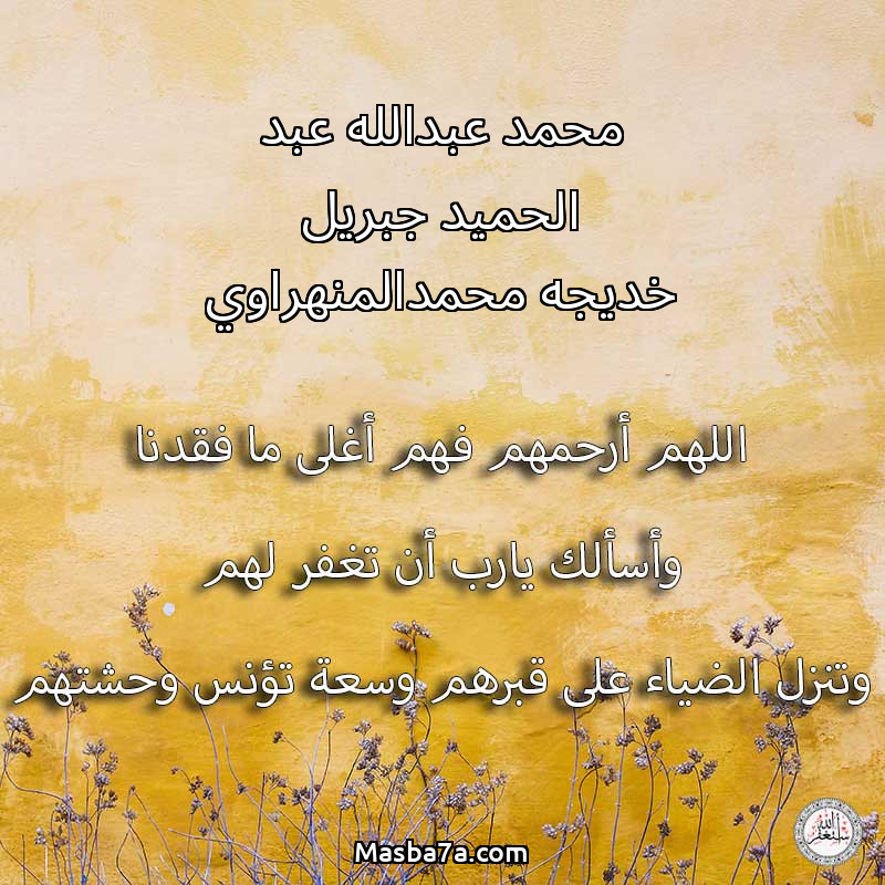 اللهم ارحم ( محمد عبدالله عبد الحميد جبريل خديجه محمدالمنهراوي ) وانس وحشتهم واجمعنا بهم في جنتك ، اللهم ارحمهم بقدر شوقنا لهم اللهم ارحمهم واغفر لهم.