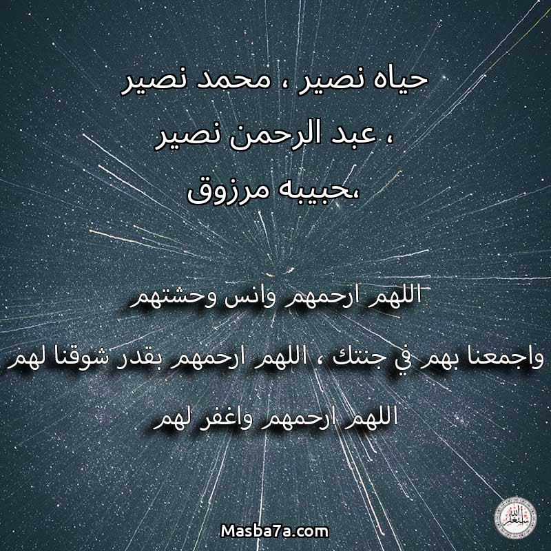 اللهم ارحم ( حياه نصير ، محمد نصير ، عبد الرحمن نصير ،حبيبه مرزوق ) وانس وحشتهم واجمعنا بهم في جنتك ، اللهم ارحمهم بقدر شوقنا لهم اللهم ارحمهم واغفر لهم.