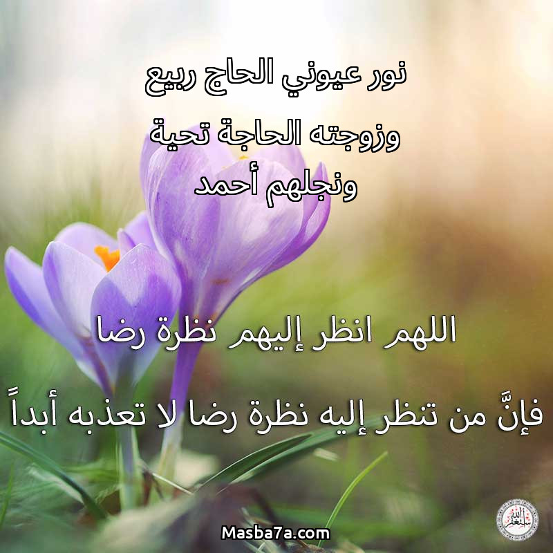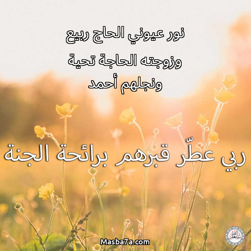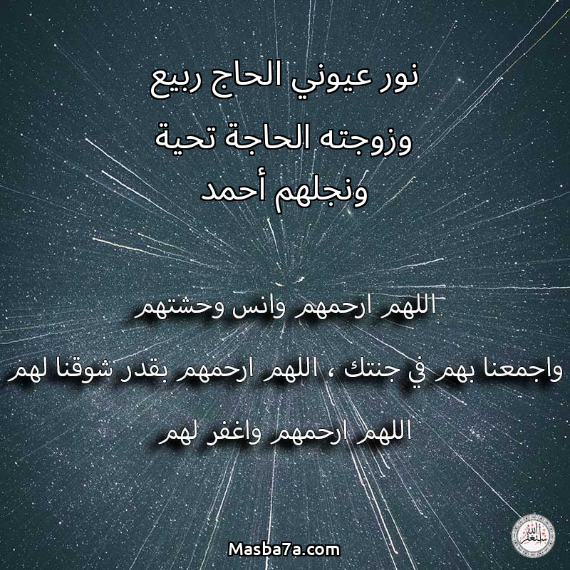 اللهم ارحم ( نور عيوني الحاج ربيع وزوجته الحاجة تحية ونجلهم أحمد ) وانس وحشتهم واجمعنا بهم في جنتك ، اللهم ارحمهم بقدر شوقنا لهم اللهم ارحمهم واغفر لهم.