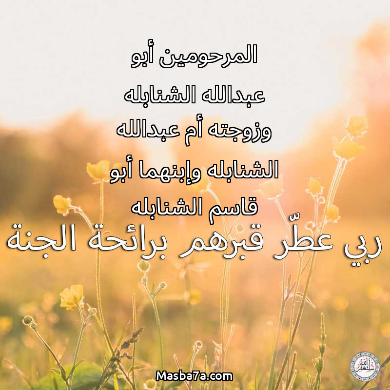 اللهم ارحم ( المرحومين أبو عبدالله الشنابله وزوجته أم عبدالله الشنابله وإبنهما أبو قاسم الشنابله ) وانس وحشتهم واجمعنا بهم في جنتك ، اللهم ارحمهم بقدر شوقنا لهم اللهم ارحمهم واغفر لهم.