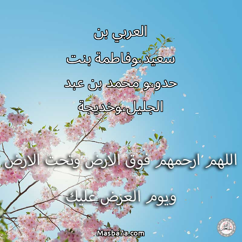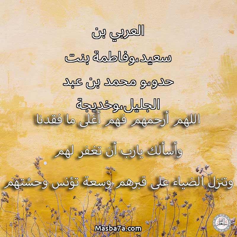 اللهم ارحم ( العربي بن سعيد،وفاطمة بنت حدو،و محمد بن عبد الجليل،وخديجة ) وانس وحشتهم واجمعنا بهم في جنتك ، اللهم ارحمهم بقدر شوقنا لهم اللهم ارحمهم واغفر لهم.