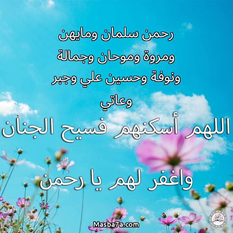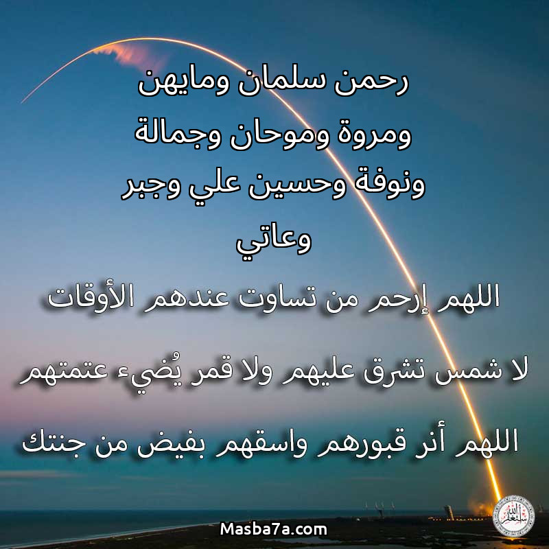 اللهم ارحم ( رحمن سلمان ومايهن ومروة وموحان وجمالة ونوفة وحسين علي وجبر وعاتي ) وانس وحشتهم واجمعنا بهم في جنتك ، اللهم ارحمهم بقدر شوقنا لهم اللهم ارحمهم واغفر لهم.