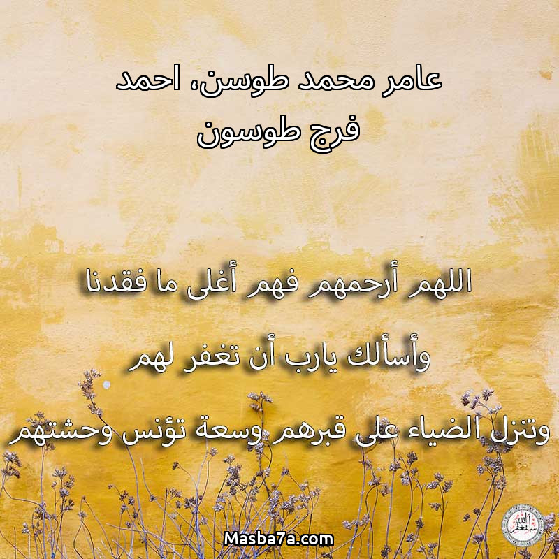 اللهم ارحم ( عامر محمد طوسن، احمد فرج طوسون ) وانس وحشتهم واجمعنا بهم في جنتك ، اللهم ارحمهم بقدر شوقنا لهم اللهم ارحمهم واغفر لهم.
