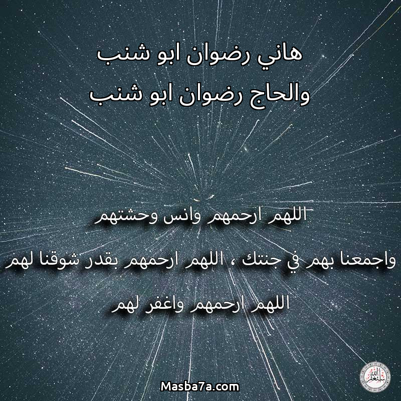 اللهم ارحم ( هاني رضوان ابو شنب والحاج رضوان ابو شنب ) وانس وحشتهم واجمعنا بهم في جنتك ، اللهم ارحمهم بقدر شوقنا لهم اللهم ارحمهم واغفر لهم.