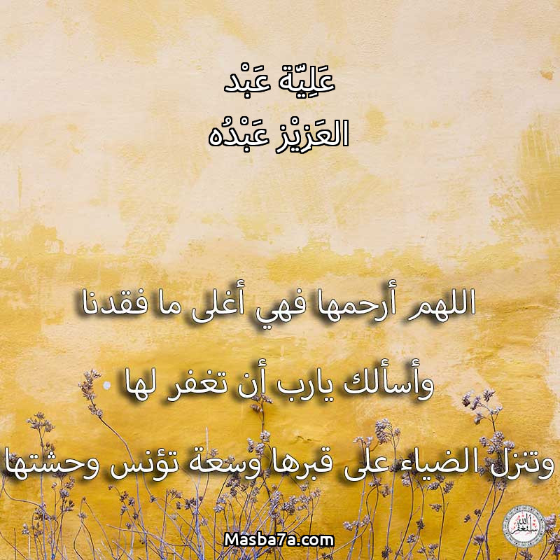 اللهم ارحم ( عَلِيَّة عَبْد العَزِيْز عَبْدُه ) وانس وحشتها واجمعنا بها في جنتك ، اللهم ارحمها بقدر شوقنا لها اللهم ارحمها واغفر لها .