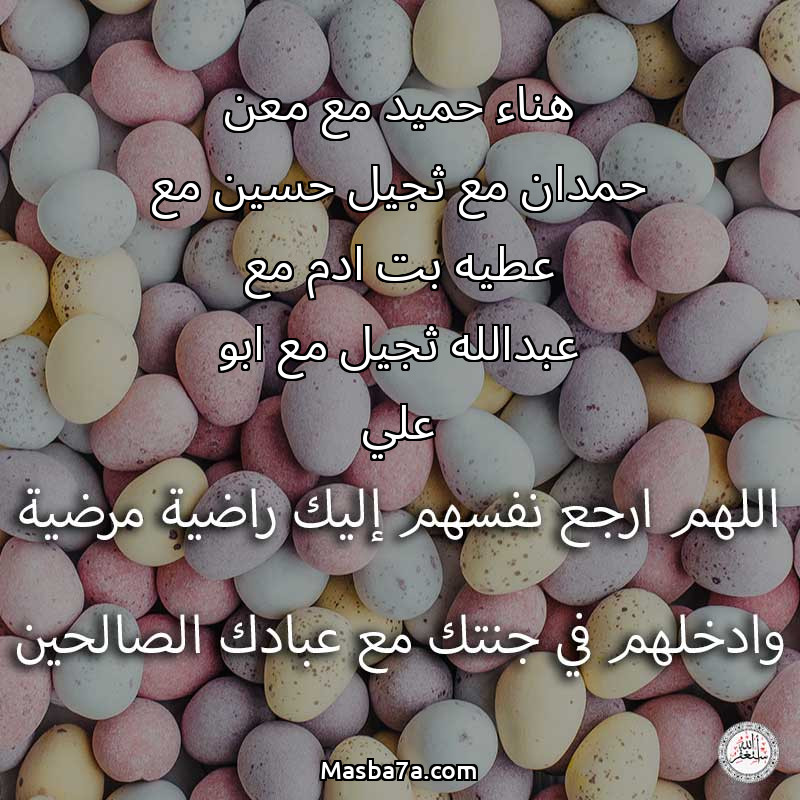 اللهم ارحم ( هناء حميد مع معن حمدان مع ثجيل حسين مع عطيه بت ادم مع عبدالله ثجيل مع ابو علي ) وانس وحشتهم واجمعنا بهم في جنتك ، اللهم ارحمهم بقدر شوقنا لهم اللهم ارحمهم واغفر لهم.