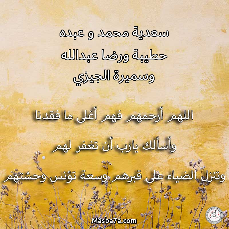 اللهم ارحم ( سعدية محمد و عبده حطيبة ورضا عبدالله وسميرة الجيزي ) وانس وحشتهم واجمعنا بهم في جنتك ، اللهم ارحمهم بقدر شوقنا لهم اللهم ارحمهم واغفر لهم.