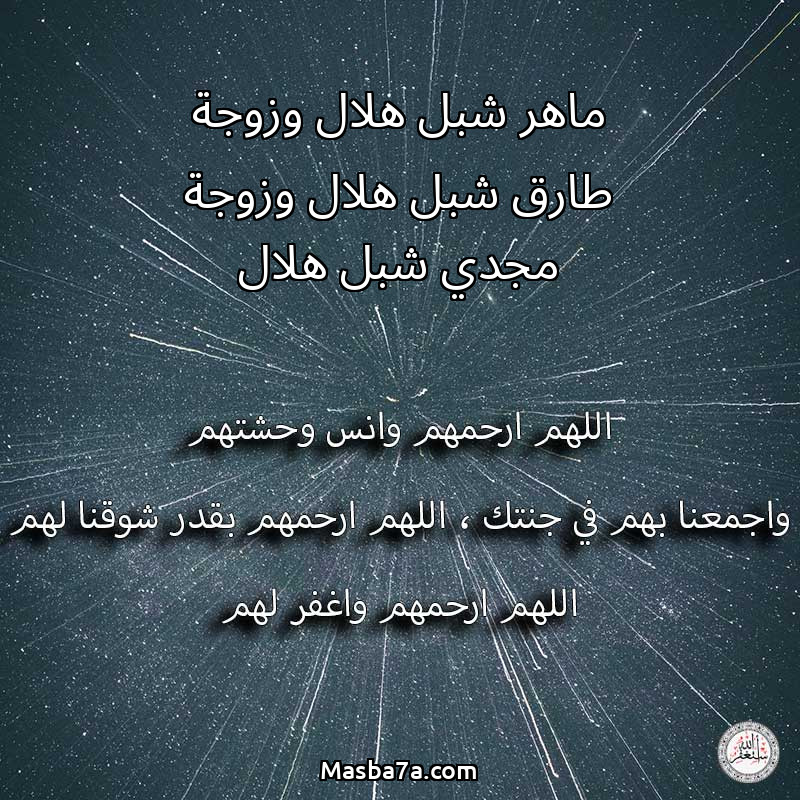 اللهم ارحم ( ماهر شبل هلال وزوجة طارق شبل هلال وزوجة مجدي شبل هلال ) وانس وحشتهم واجمعنا بهم في جنتك ، اللهم ارحمهم بقدر شوقنا لهم اللهم ارحمهم واغفر لهم.