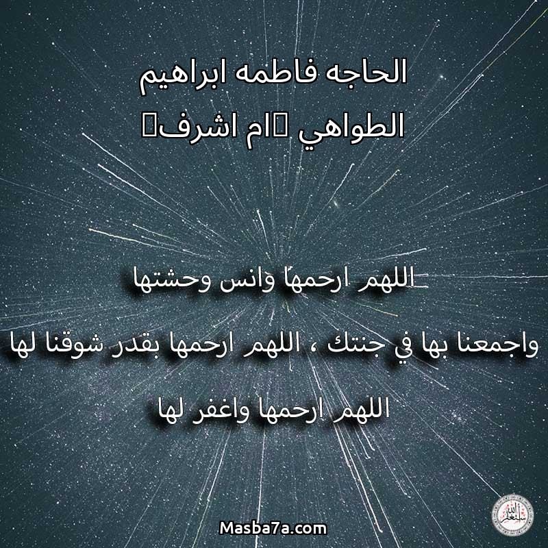 اللهم ارحم ( الحاجه فاطمه ابراهيم الطواهي (ام اشرف) ) وانس وحشتها واجمعنا بها في جنتك ، اللهم ارحمها بقدر شوقنا لها اللهم ارحمها واغفر لها .