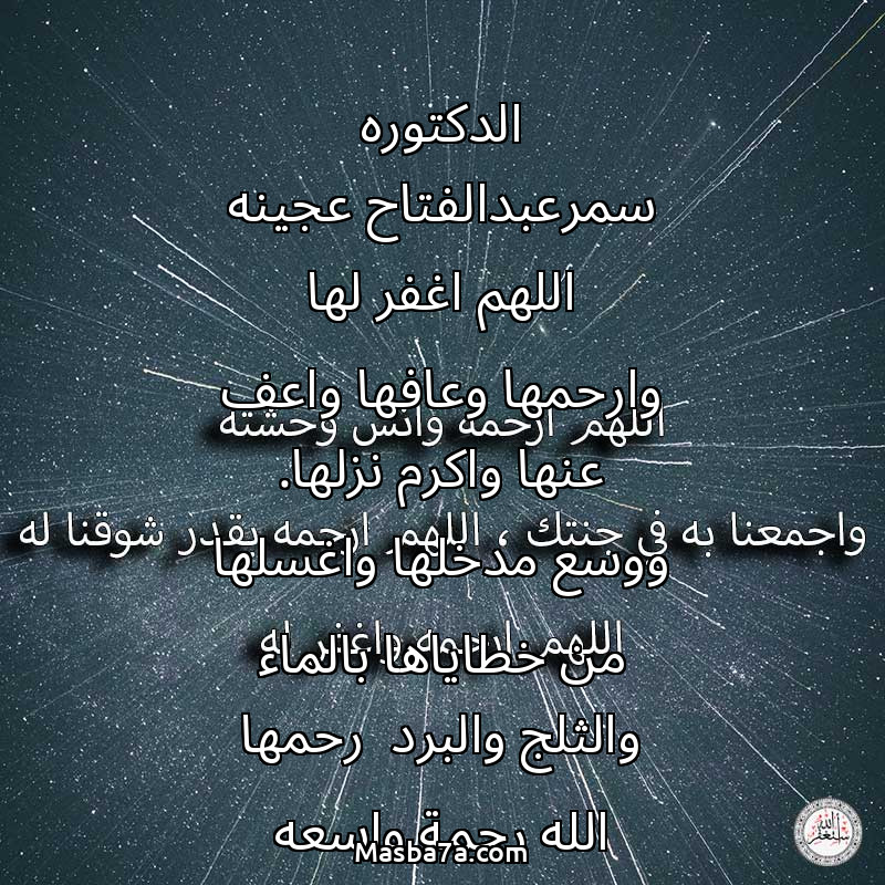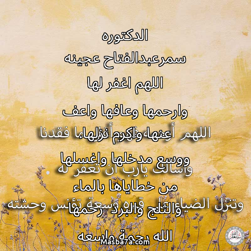 دعاء عن روح المرحوم الدكتوره سمرعبدالفتاح عجينه اللهم اغفر لها وارحمها وعافها واعف عنها واكرم نزلها. ووسع مدخلها واغسلها من خطاياها بالماء والثلج والبرد رحمها الله رحمة واسعه واسكنها فسيح جناته مع النبيين والصديقين والشهداء والصالحين وحسن أولئك رفيقا