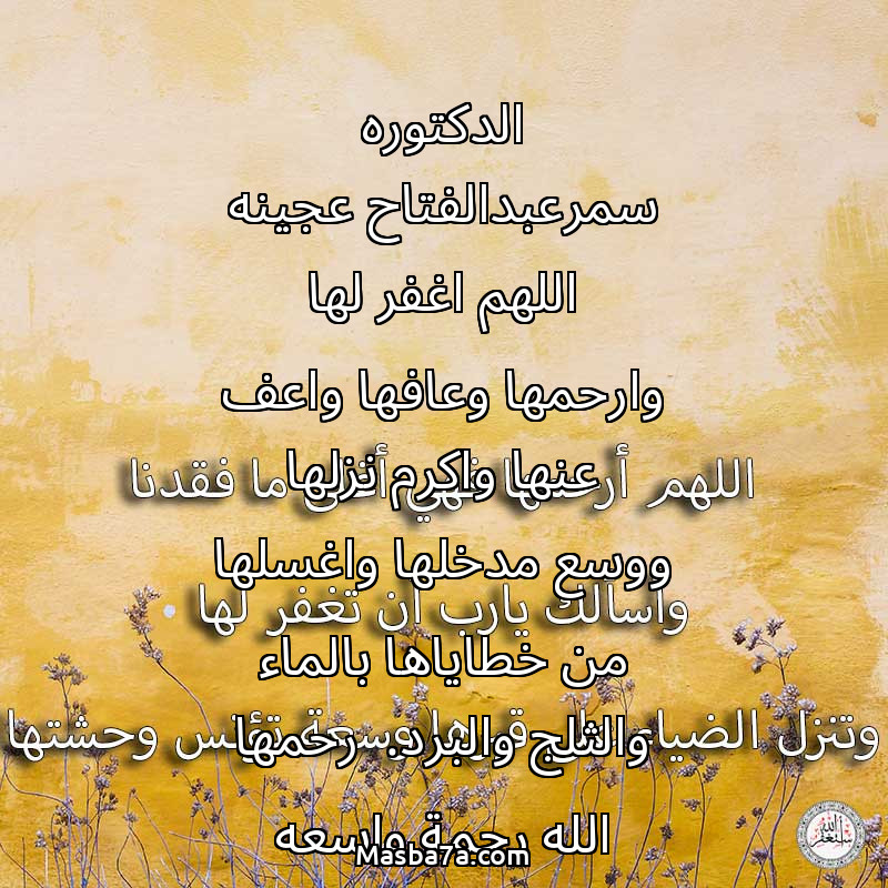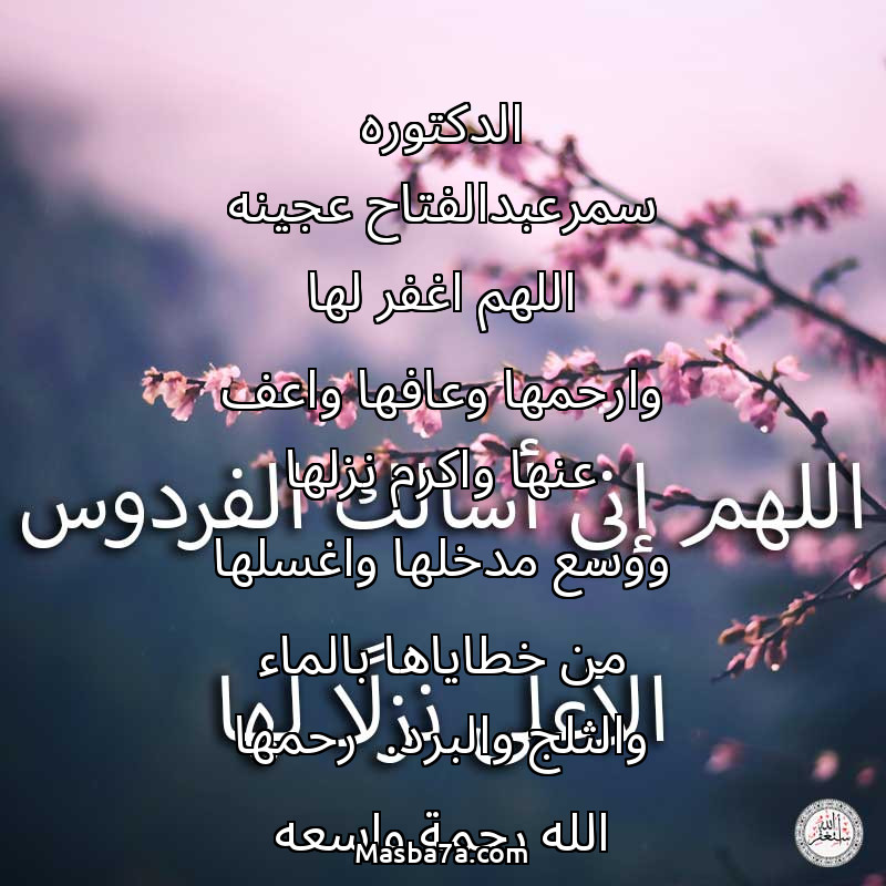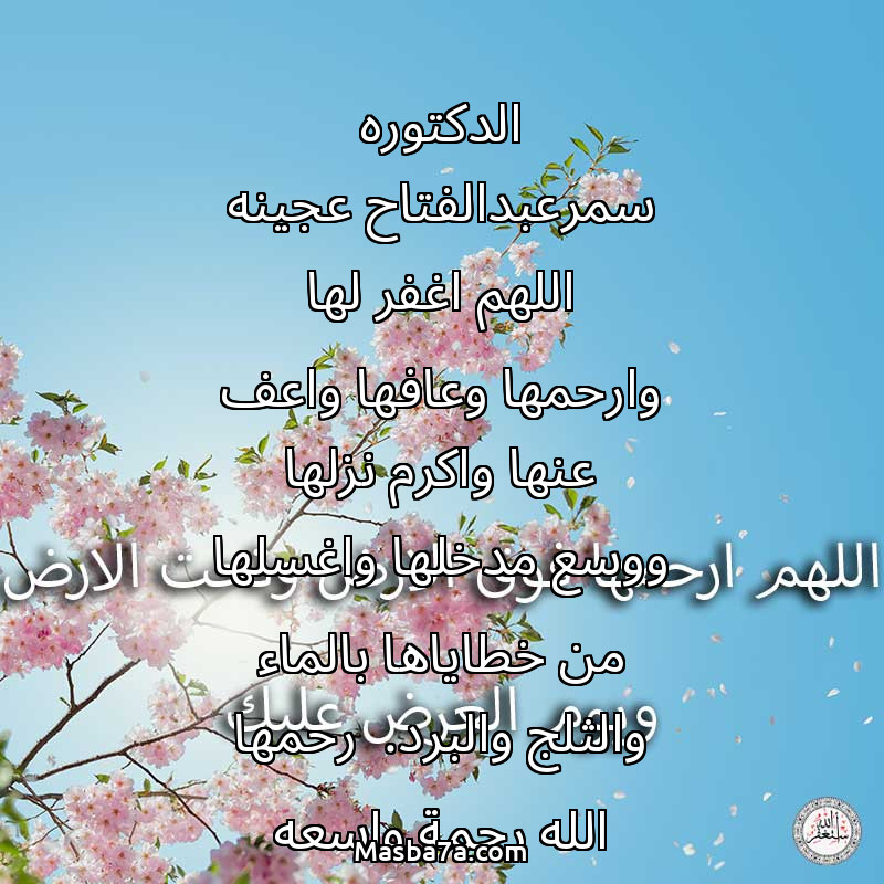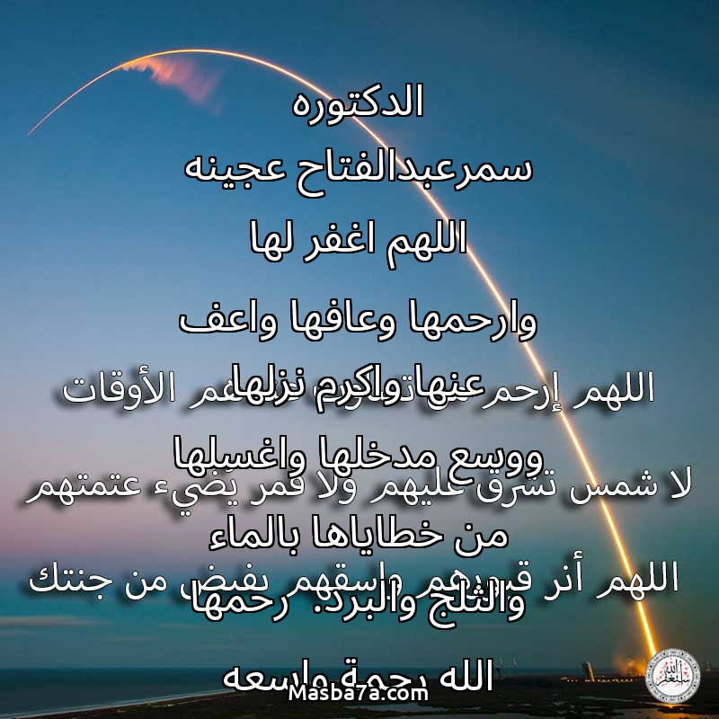 اللهم ارحم ( الدكتوره سمرعبدالفتاح عجينه اللهم اغفر لها وارحمها وعافها واعف عنها واكرم نزلها ووسع مدخلها واغسلها من خطاياها بالماء والثلج والبرد. رحمها الله رحمة واسعه واسكنها فسيح جناته مع النبيين والصديقين والشهداء والصالحين وحسن أولئك رفيقا ) وانس وحشتها واجمعنا بها في جنتك ، اللهم ارحمها بقدر شوقنا لها اللهم ارحمها واغفر لها .