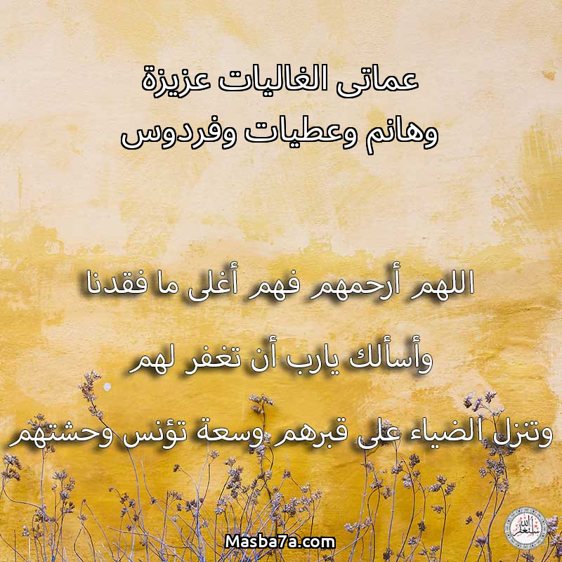 اللهم ارحم ( عماتى الغاليات عزيزة وهانم وعطيات وفردوس ) وانس وحشتهم واجمعنا بهم في جنتك ، اللهم ارحمهم بقدر شوقنا لهم اللهم ارحمهم واغفر لهم.