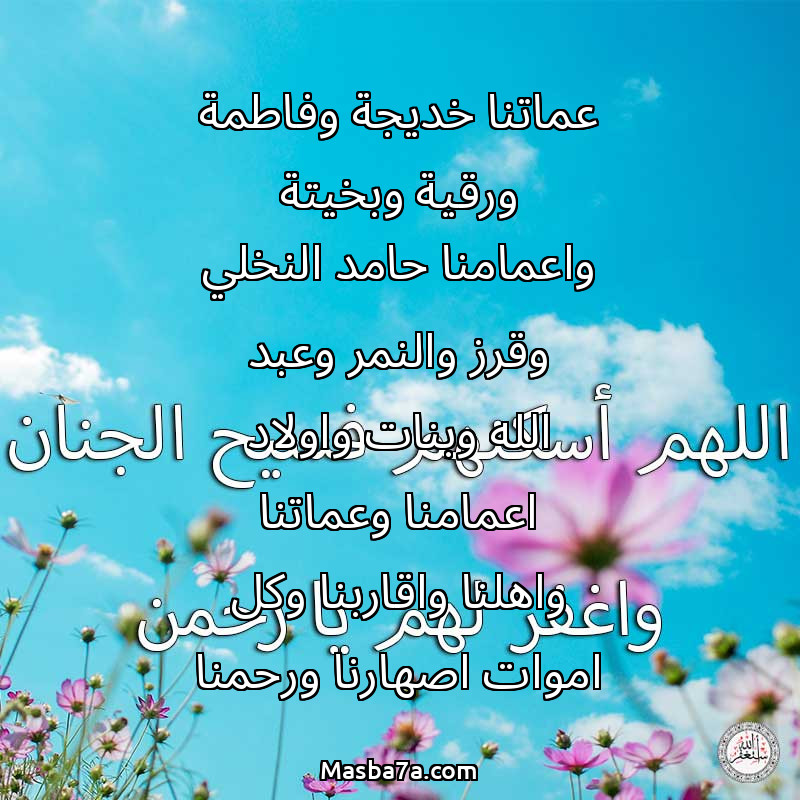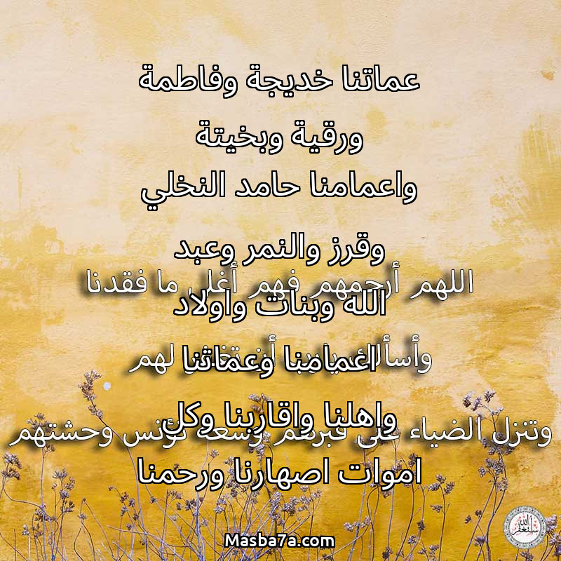 دعاء عن أرواح المرحومين عماتنا خديجة وفاطمة ورقية وبخيتة واعمامنا حامد النخلي وقرز والنمر وعبد الله وبنات واولاد اعمامنا وعماتنا واهلنا واقاربنا وكل اموات اصهارنا ورحمنا
