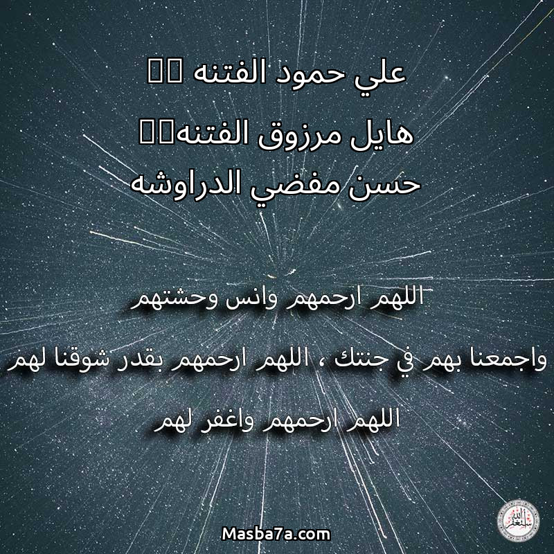 اللهم ارحم ( علي حمود الفتنه '' هايل مرزوق الفتنه'' حسن مفضي الدراوشه ) وانس وحشتهم واجمعنا بهم في جنتك ، اللهم ارحمهم بقدر شوقنا لهم اللهم ارحمهم واغفر لهم.