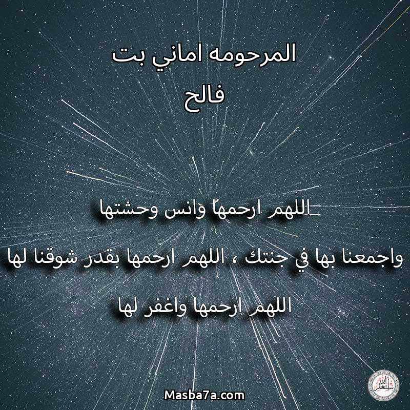 اللهم ارحم ( المرحومه اماني بت فالح ) وانس وحشتها واجمعنا بها في جنتك ، اللهم ارحمها بقدر شوقنا لها اللهم ارحمها واغفر لها .