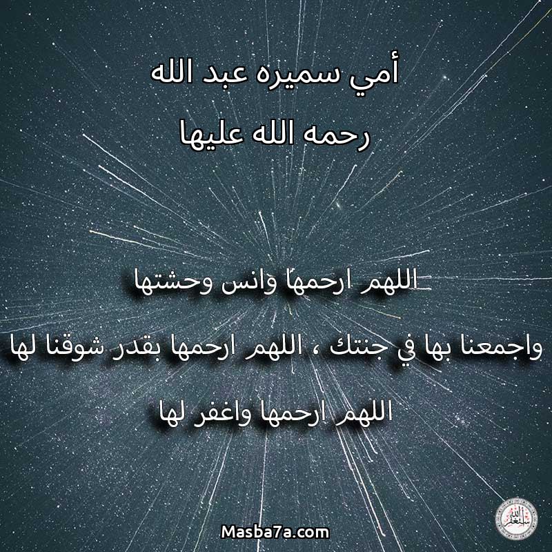 اللهم ارحم ( أمي سميره عبد الله رحمه الله عليها ) وانس وحشتها واجمعنا بها في جنتك ، اللهم ارحمها بقدر شوقنا لها اللهم ارحمها واغفر لها .
