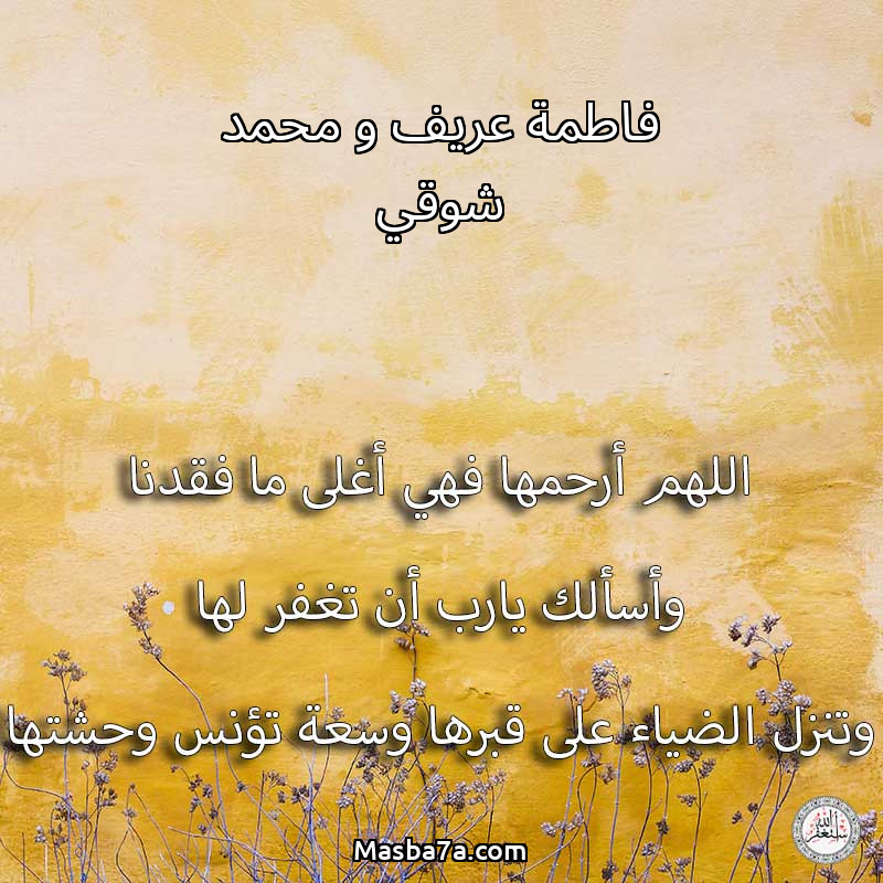 اللهم ارحم ( فاطمة عريف و محمد شوقي ) وانس وحشتها واجمعنا بها في جنتك ، اللهم ارحمها بقدر شوقنا لها اللهم ارحمها واغفر لها .