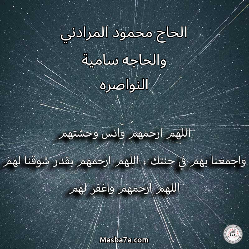 اللهم ارحم ( الحاج محمود المرادني والحاجه سامية النواصره ) وانس وحشتهم واجمعنا بهم في جنتك ، اللهم ارحمهم بقدر شوقنا لهم اللهم ارحمهم واغفر لهم.