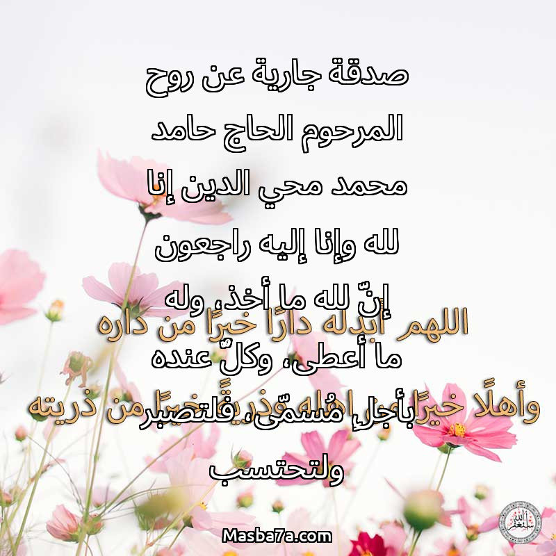 صدقة جارية عن روح المرحوم الحاج حامد محمد محي الدين إنا لله وإنا إليه راجعون إنَّ لله ما أخذ، وله ما أعطى، وكلٌّ عنده بأجلٍ مُسمّى، فلتصبر ولتحتسب