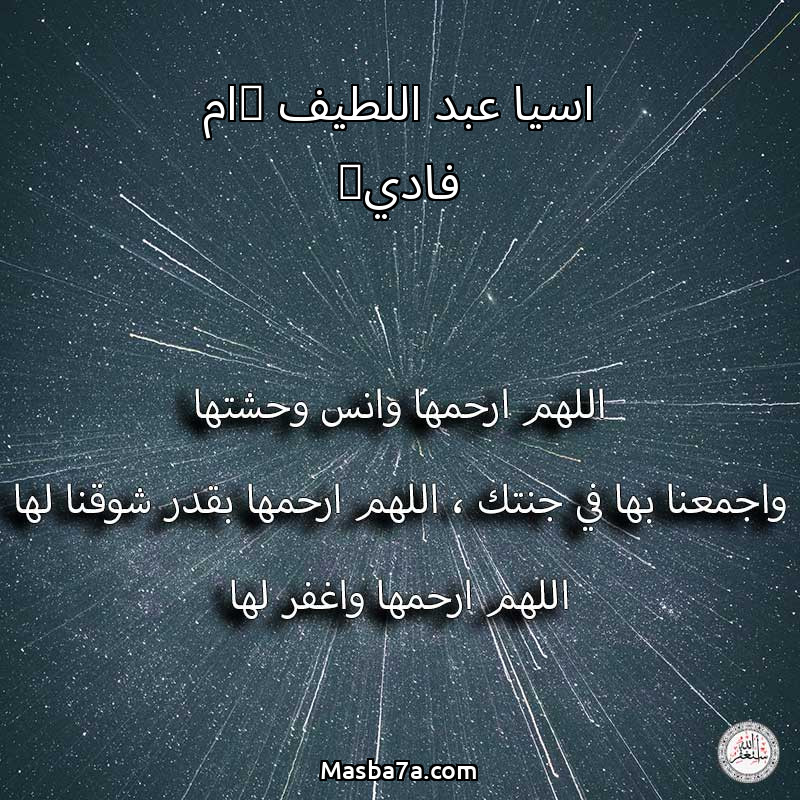 اللهم ارحم ( اسيا عبد اللطيف (ام فادي) ) وانس وحشتها واجمعنا بها في جنتك ، اللهم ارحمها بقدر شوقنا لها اللهم ارحمها واغفر لها .