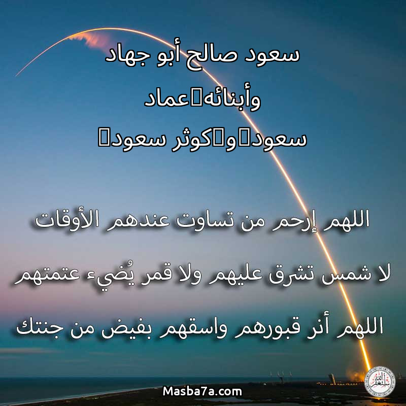 اللهم ارحم ( سعود صالح أبو جهاد وأبنائه(عماد سعود)و(كوثر سعود) ) وانس وحشتهم واجمعنا بهم في جنتك ، اللهم ارحمهم بقدر شوقنا لهم اللهم ارحمهم واغفر لهم.