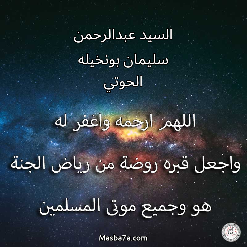 اللهم ارحم ( السيد عبدالرحمن سليمان بونخيله الحوتي ) وانس وحشته واجمعنا به في جنتك ، اللهم ارحمه بقدر شوقنا له اللهم ارحمه واغفر له .