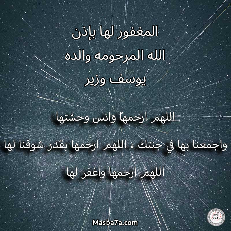 اللهم ارحم ( المغفور لها بإذن الله المرحومه والده يوسف وزير ) وانس وحشتها واجمعنا بها في جنتك ، اللهم ارحمها بقدر شوقنا لها اللهم ارحمها واغفر لها .