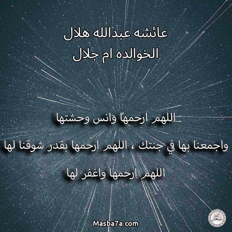 اللهم ارحم ( عائشه عبدالله هلال الخوالده ام جلال ) وانس وحشتها واجمعنا بها في جنتك ، اللهم ارحمها بقدر شوقنا لها اللهم ارحمها واغفر لها .