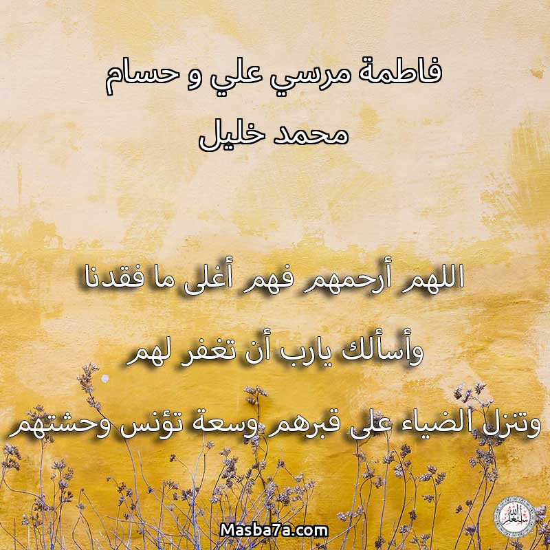 اللهم ارحم ( فاطمة مرسي علي و حسام محمد خليل ) وانس وحشتهم واجمعنا بهم في جنتك ، اللهم ارحمهم بقدر شوقنا لهم اللهم ارحمهم واغفر لهم.