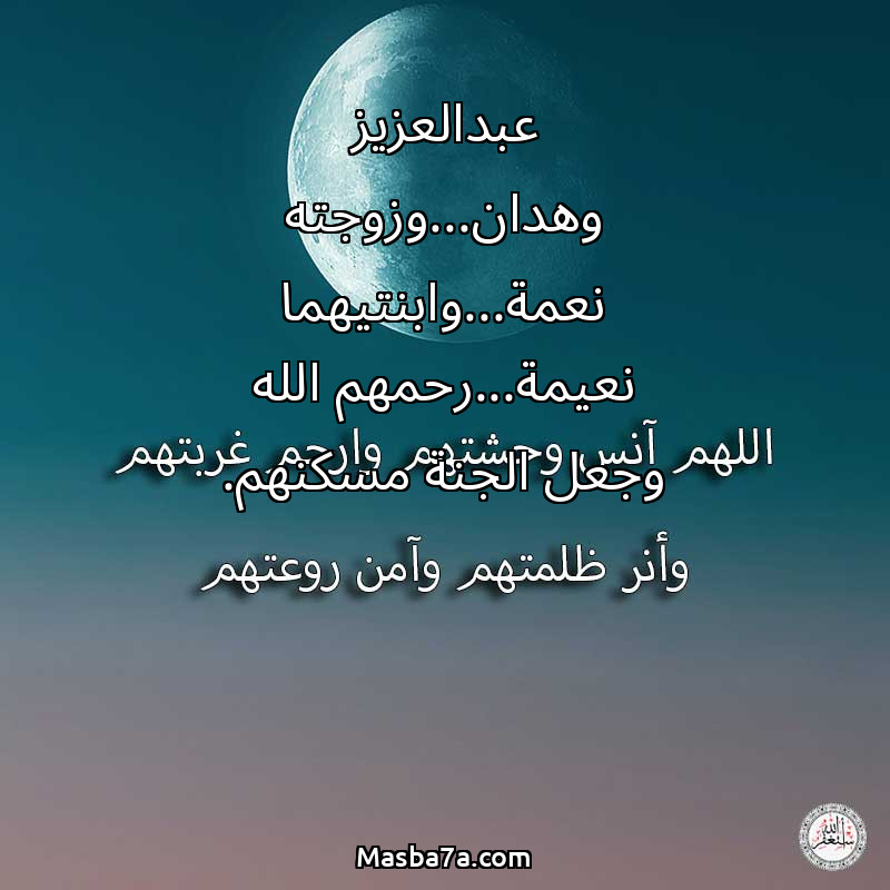 دعاء عن أرواح المرحومين عبدالعزيز وهدان...وزوجته نعمة...وابنتيهما نعيمة...رحمهم الله وجعل الجنة مسكنهم.